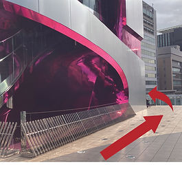 目の前にエスカレーターが見えたら、左手にピンクの建物が見えます。ピンクの建物に向かって直進します。